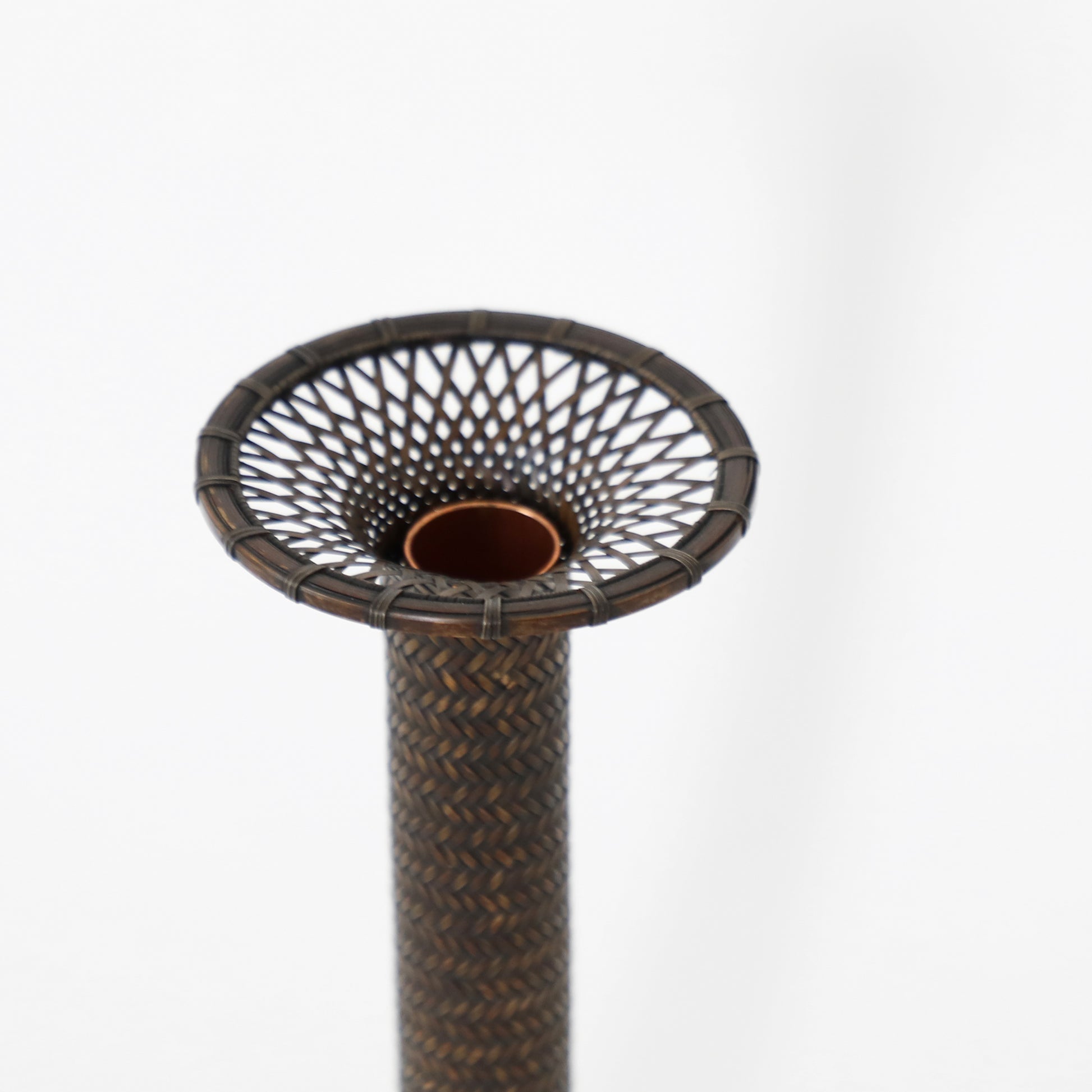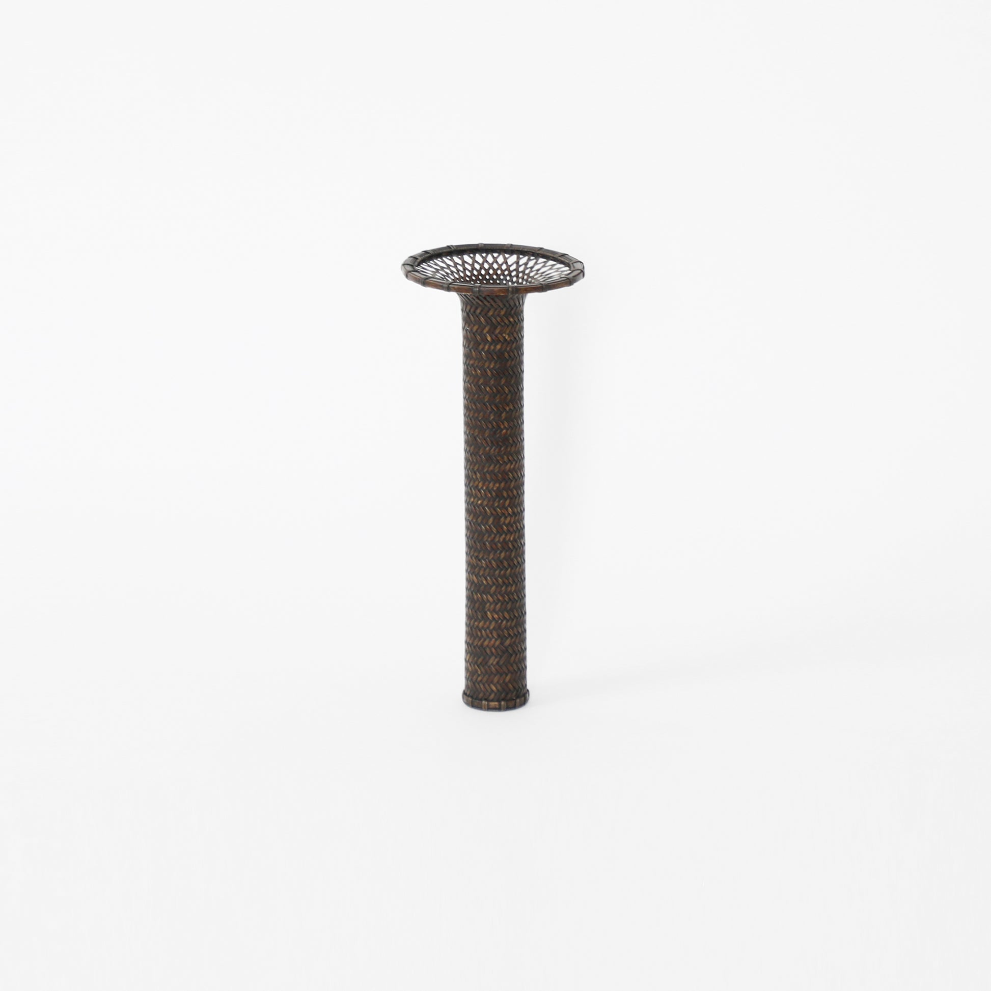 2色の籤をあじろ編みで編み、漆で仕上げました。編地に漆が入り、色の濃淡による陰影がうまれます。お花を活けることはもちろんですが、そのままの佇まいが美しい作品です。