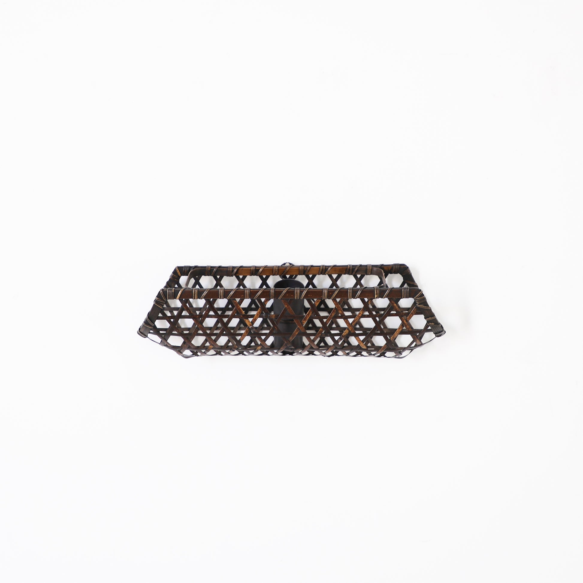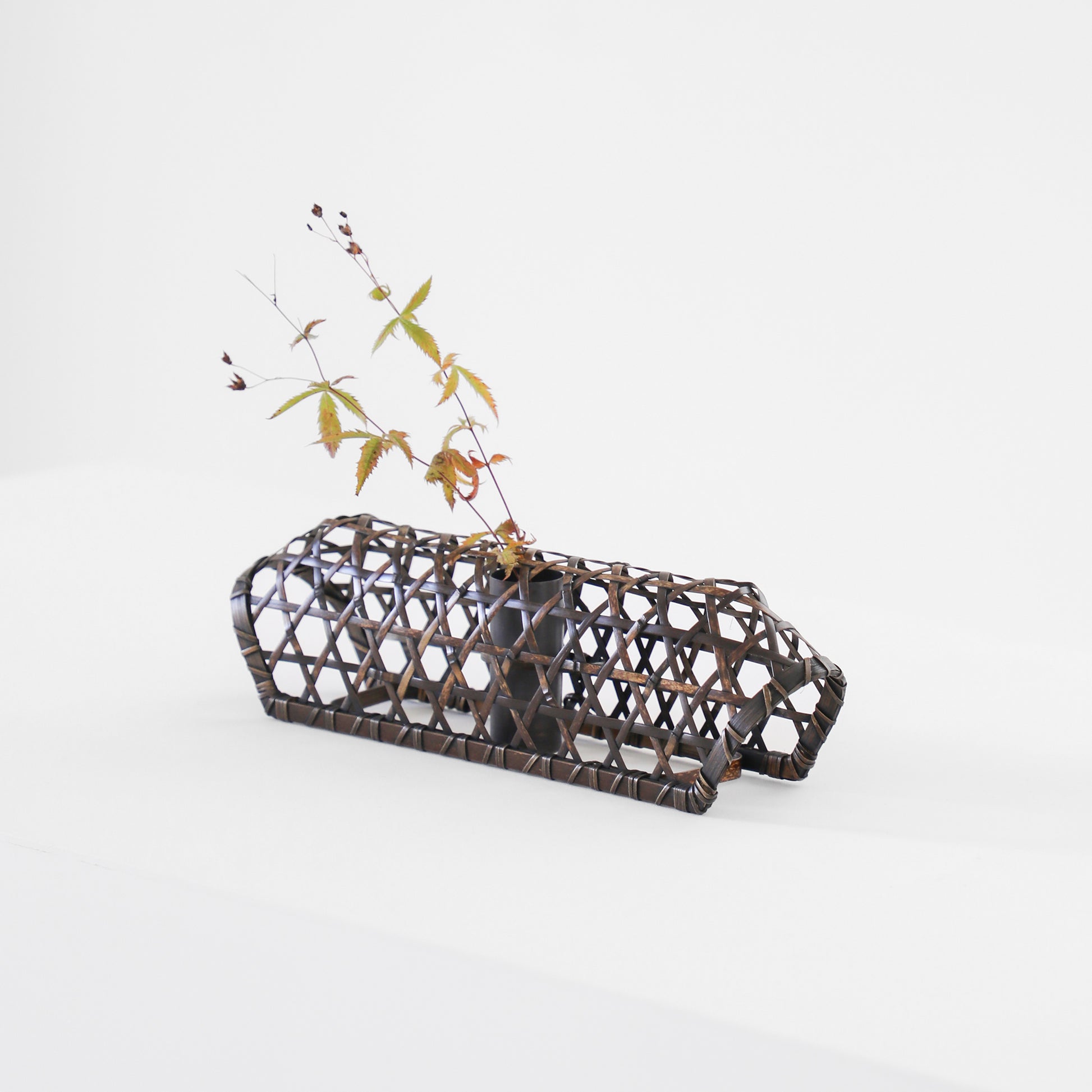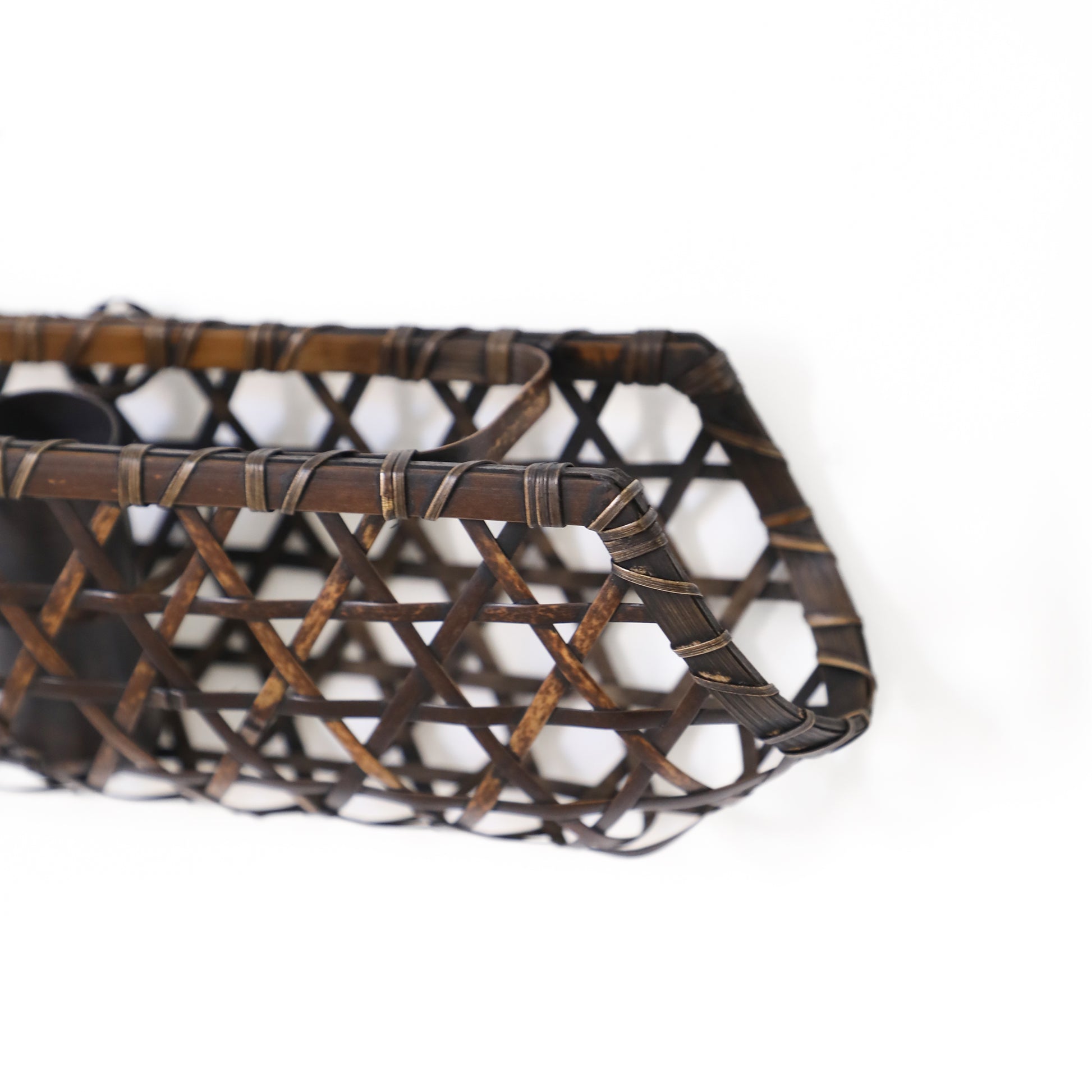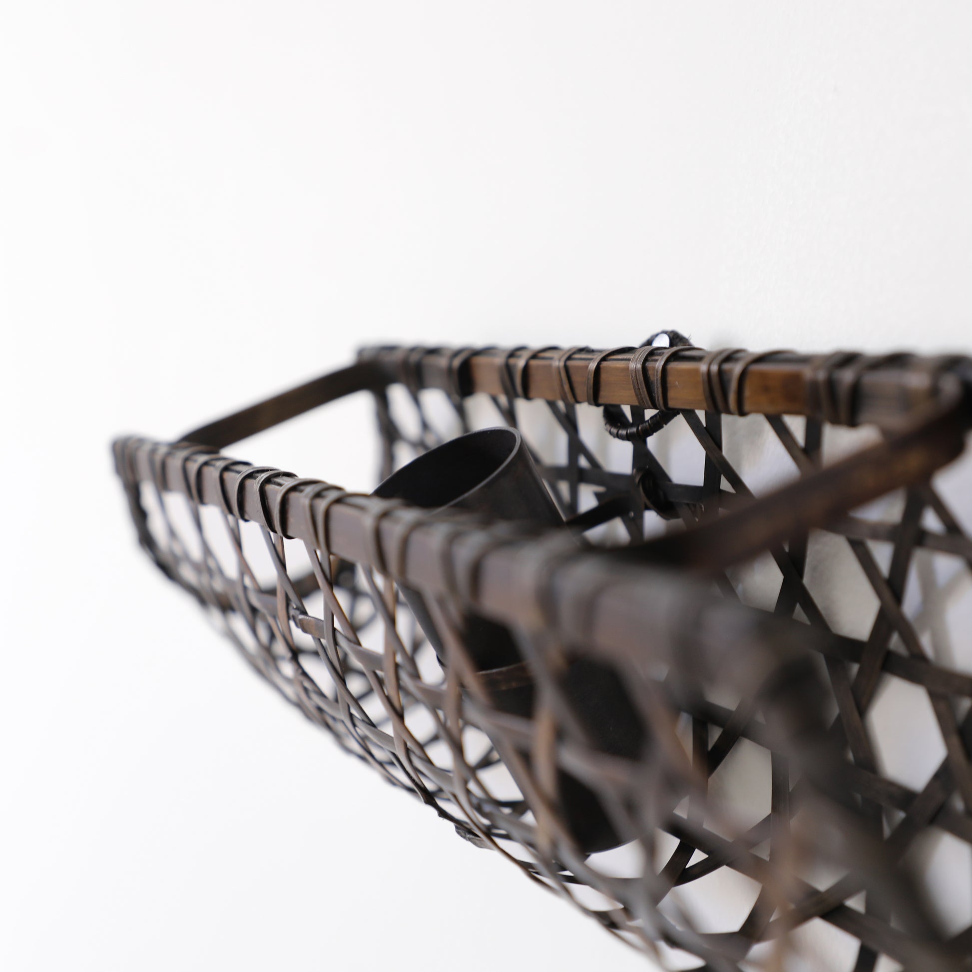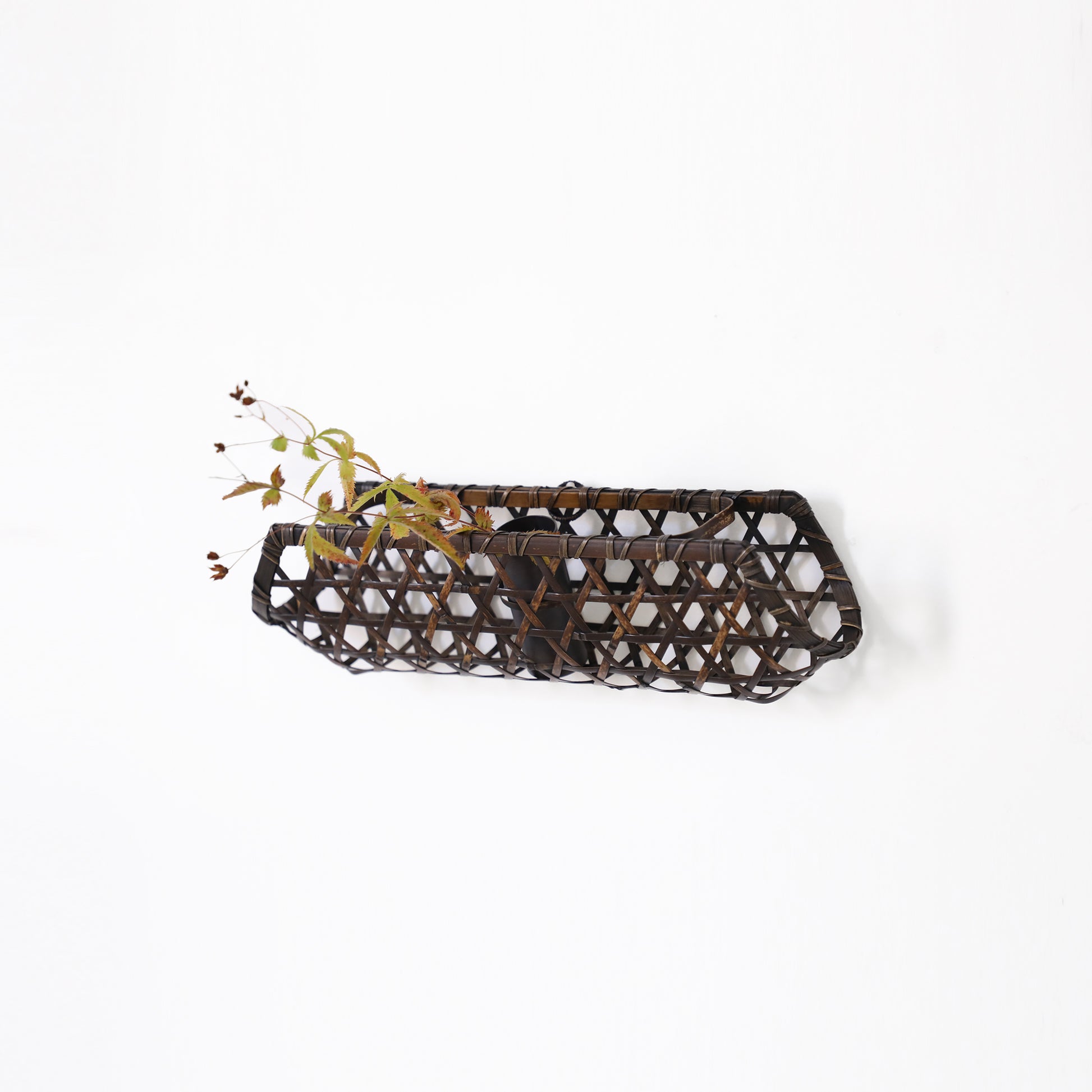 均等に心地よいリズムで編まれた六つ目の花籠。鳥の名をもつこの作品は直線的な造形で、掛けても置いてもお使いいただけます。