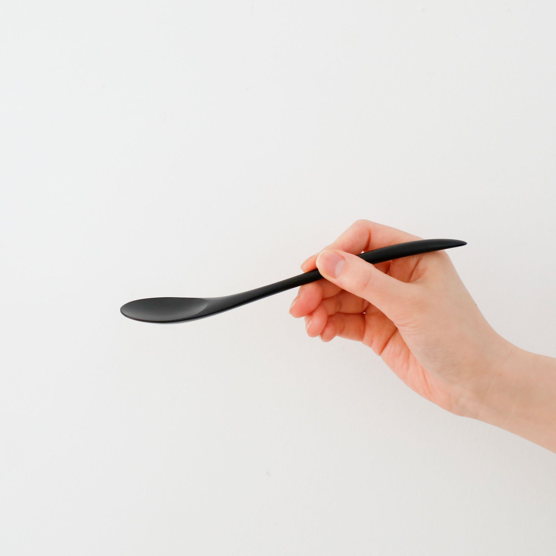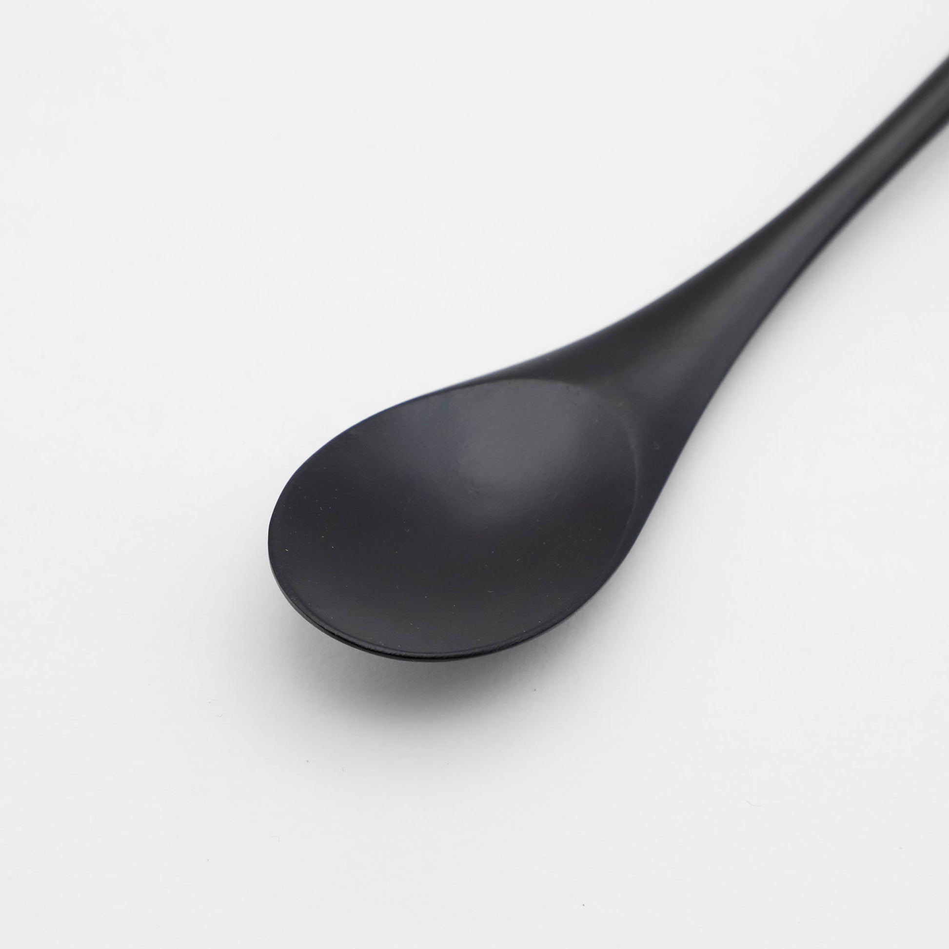 黒漆をほどこしたスプーン。掬う部分が浅く、柄も長くすっきりとしたデザイン。カレーやスープにもおすすめです。軽やかでありながらも端正な佇まいで日々の食卓を彩ります。